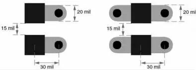 由于印制线越宽,电感越小,从焊盘到过孔的引出线尽量加宽,如果可能,尽量和焊盘宽度相同。这样即使是0402封装的电容,你也可以使用20mil宽的引出线。引出线和过孔安装如图4所示,注意图中的各种尺寸。