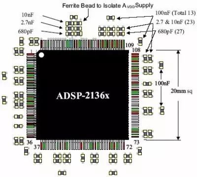 放置在有源器件傍的高频滤波电容的作用有两个,其一是滤除沿电源传导过来的高频干扰,其二是及时补充器件高速工作时所需的尖峰电流。所以电容的放置位置是需要考虑的。