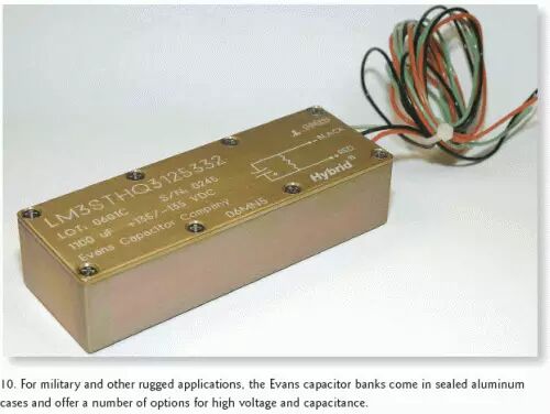 Evans Capacitor公司的3STHQ3和3PTHQ3电容组器件则主要用于任务繁重的军事应用,它将公司的三个THQ3混合电容集成进了一个阳极电镀、环氧密封的铝壳中,整个尺寸为4.47×1.59×1.09英寸(图10)。针对更高的工作电压,3STHQ3组可以串联电容的方式提供以下四种产品:0.004 F/160 Vdc, 0.0028F/200Vdc, 0.0019F/250Vdc和0.0011F/300Vdc。