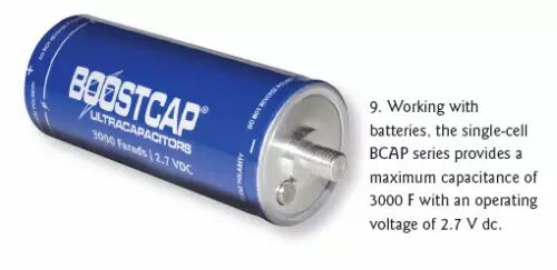 Maxwell Technologies公司还有许多大型的具有很高容量的BOOSTCAP品牌单节电容器,不过工作电压比较低。BCAP系列共5节,在2.7Vdc的工作电压下电容值可达650、1200、11500、2000和3000F(图9)。这些电容的主要用途是与电池并行工作,适合要求恒定低功率放电以及峰值负载下提供脉冲功率的应用。