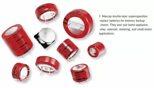 Kanthal Globar公司的Maxcap双层电容器可以用来代替作为存储器后备电源的电池,具有超过5.5 F/in.3的容积效率、无限的服务寿命、快速充放电能力和非常低的漏电流等特性(图7)。Kanthal Globar公司还表示,这些电容比电池更安全,在短路时不会爆炸,也不会损坏。这些电容器是非极化器件,不需要限流电阻或过压保护,因而可以消除装配错误和相关的成本。