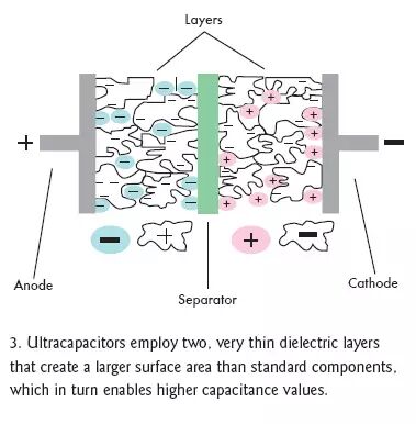 双电层电容器(EDLC)正如它的字面意义那样可以解决上述问题,它在相同的封装内增加了第二个电介层,这个电介层与第一层在中间隔离物的两边并行工作(图3)。EDLC也采用无孔电介质,如活性碳、碳纳米管、炭黑凝胶,并选用导电聚合物,其存储容量要比标准的电解材料高出许多。额外层和更高效电介材料的这种组合能使电容容量提高近4个数量级。
