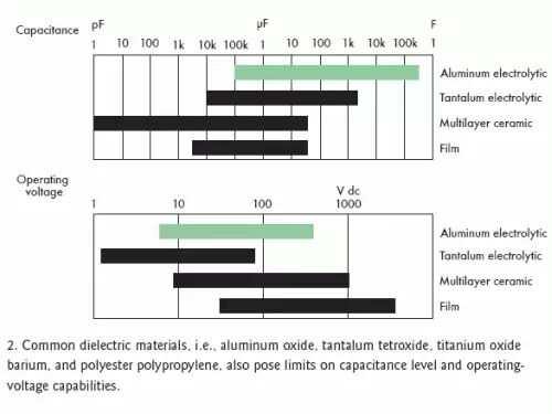 标准电容的结构是在两个附属于金属板上的电极之间夹一层电介质层(图1)。根据电容类型不同,电介质可以是氧化铝、四氧化钽、氧化钛钡或聚丙烯聚酯,不同的材料决定了不同的容量和电压特性(图2)。电介质的多少和极板间的距离也会影响电容量。然而,极板间最大允许距离限制了电介质的数量。