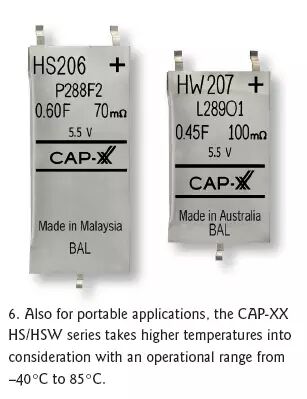 同样针对紧凑空间设计但可耐更高温度的CAP-XX公司HS和HW系列电容器具有很薄的外壳,工作温度范围是-40℃到85℃(图6)。在4.5到5.5V电压范围内,HW的尺寸为28.5x17mm。在5.5V电压时的电容量可达0.4F,ESR在 5.5V时可低至100 mΩ。
