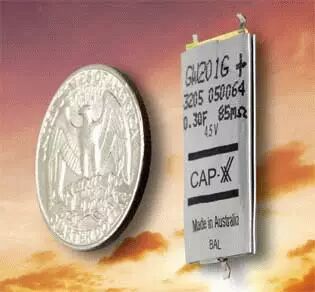 CAP-XX公司专门针对便携式市场推出了GS/GW系列单节和双节超级电容器(图5)。这些电容提供了电能有限的电池的替代品,寿命非常长,单节配置电压为2.3V,串联连接的双节电容器电压可达4.5V。