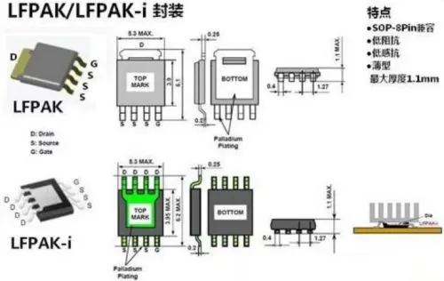 LFPAK和LFPAK-I是瑞萨开发的另外2种与SO-8兼容的小形封装。LFPAK类似D-PAK,但比D-PAK体积小。LFPAK-i是将散热板向上,通过散热片散热。