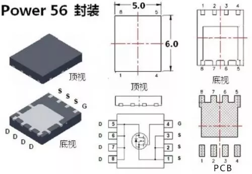 Power 56是Farichild的专用称呼,正式名称为DFN 5×6。其封装面积跟常用的TSOP-8不相上下,而薄型封装又节约元件净空高度,底部Thermal-Pad设计降低了热阻,因此很多功率器件厂商都部署了DFN 5×6。