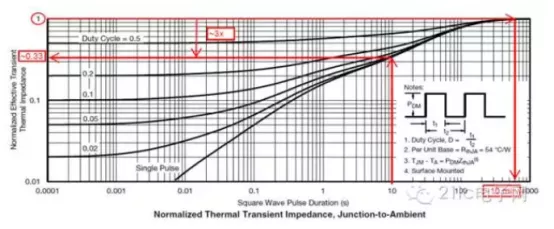 对于连续的功率耗散也要考虑类似的情况,功耗耗散不仅取决于温度,而且取决于导通时间。设想一个器件在TA= 70℃情况下,以PD=4W连续工作10秒钟。构成“连续”时间周期的因素会根据MOSFET封装而变化,所以你要使用数据表里的标准化热瞬态阻抗图,看经过10秒、100秒或10分钟后的功率耗散是什么样的。如图3所示,这个专用器件经过10秒脉冲后的热阻系数大约是0.33,这意味着经过大约10分钟后,一旦封装达到热饱和,器件的散热能力只有1.33W而不是4W,尽管在良好冷却的情况下器件的散热能力可以达到2W左右。