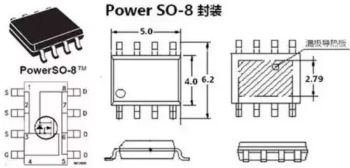标准的SO-8封装采用塑料将芯片包围,低热阻的热传导通路只是芯片到PCB的引脚。而底部紧贴PCB的塑料外壳是热的不良导体,故而影响了漏极的散热。