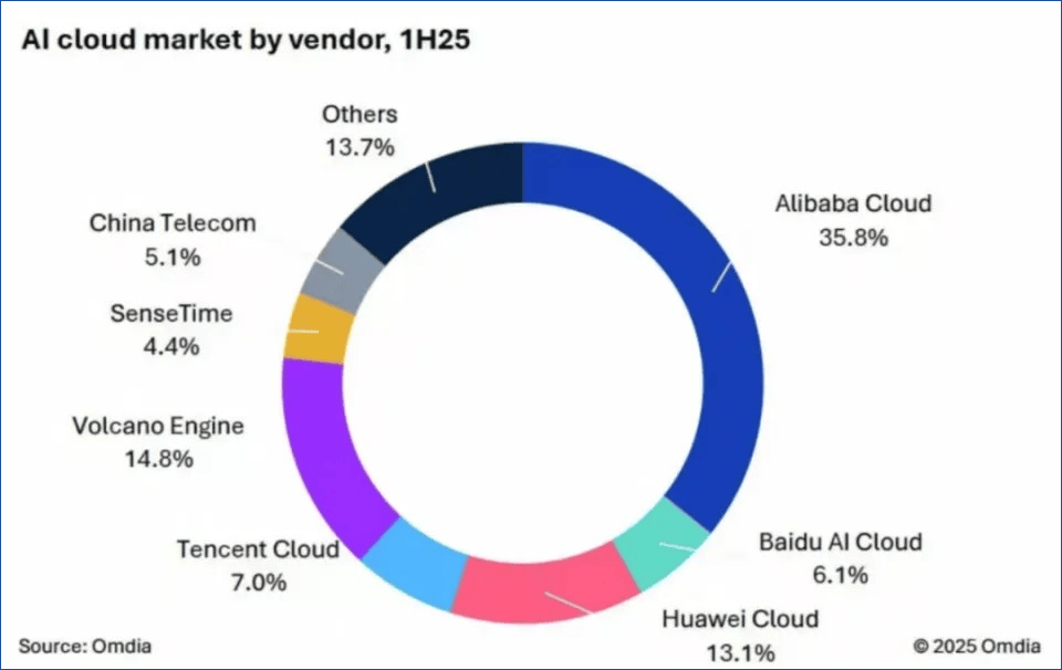 ●Omdia《中国 AI 云市场,25H1》报告显示,2025 年上半年中国 AI 云市场份额前三为阿里云(35.8%)、火山引擎(14.8%)、华为云(13.1%),商汤科技以 4.4% 的份额处于末位;