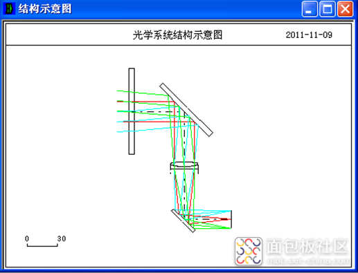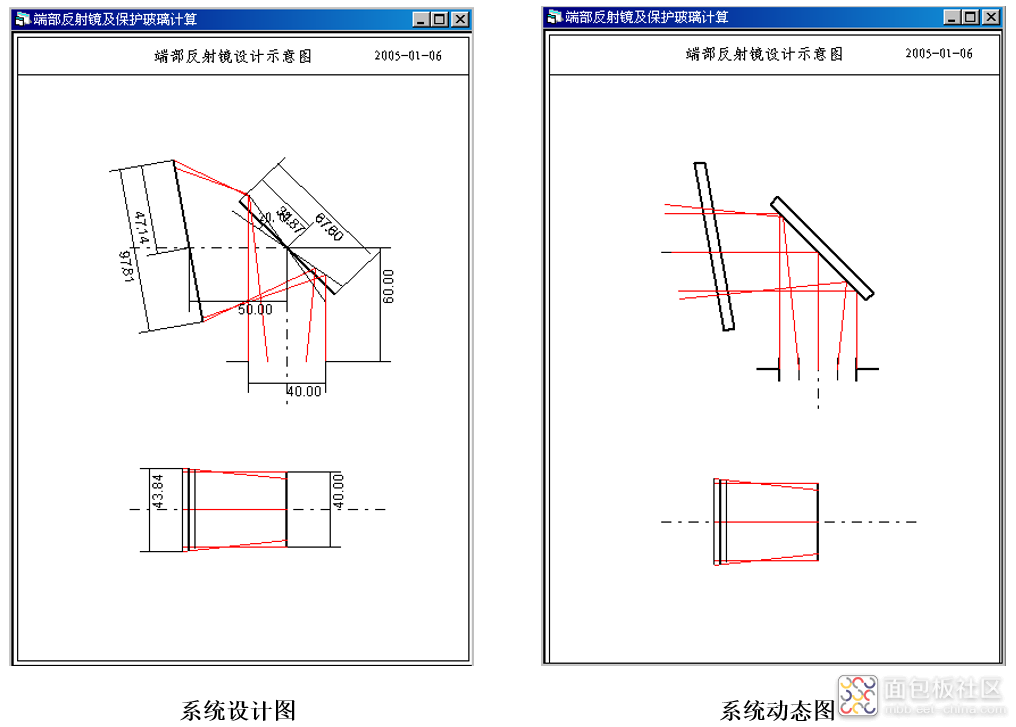 具有端部反射镜(棱镜)及保护玻璃的扫描光学系统,由于其端部反射镜(棱镜)是个运动部件,其前保护玻璃可能是三维倾斜的,因此不易计算他们的外形尺寸。为此本程序包含了这个小部件的外形尺寸计算功能。在选择“设计”菜单中的“端部反射镜及保护玻璃”后,会出现一个小窗体。窗体上要求填写有关端部反射镜、保护玻璃以及系统性能的一些数据。填写完毕,选择工具条上确定按钮,然后就能自动计算幷画出这一小部件的图形,同时还可以在菜单上选择反射镜运动效果图如图2。