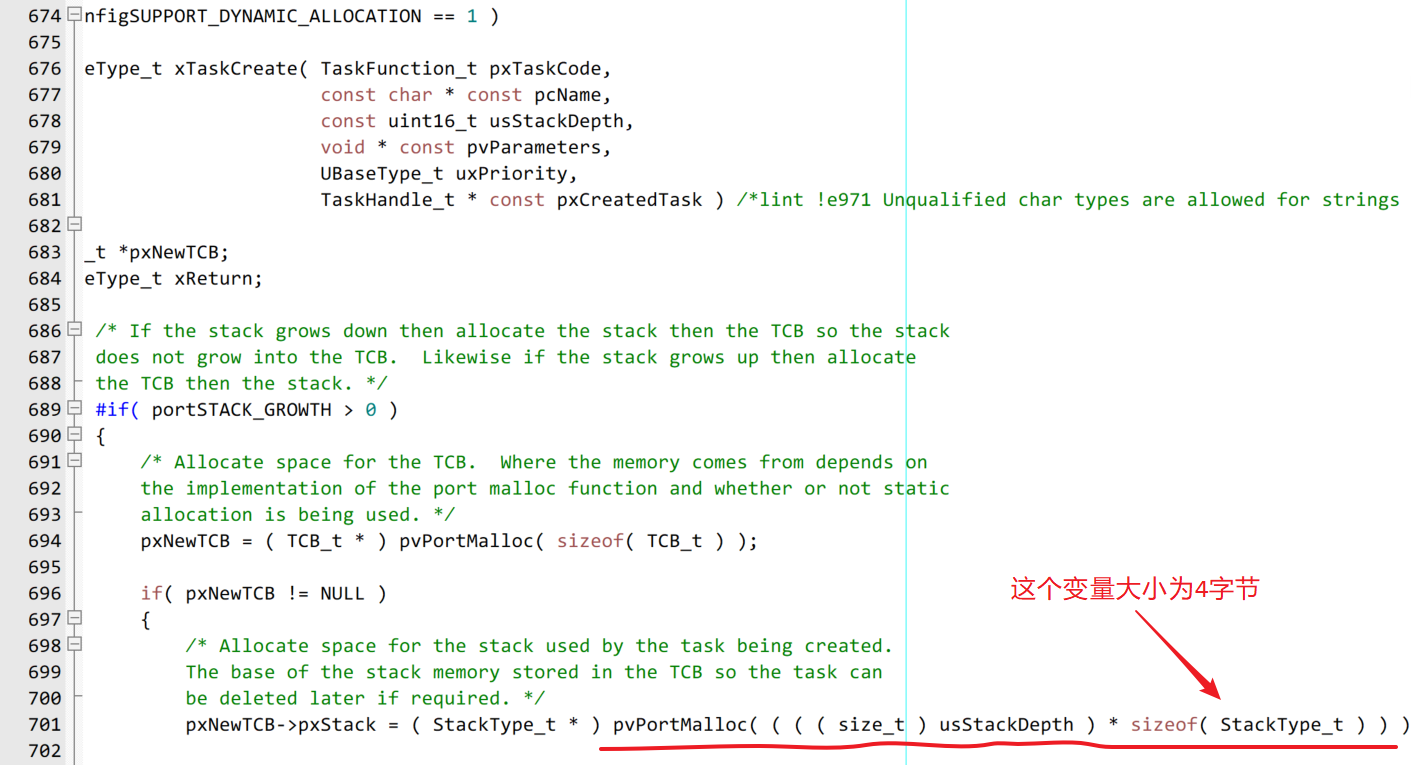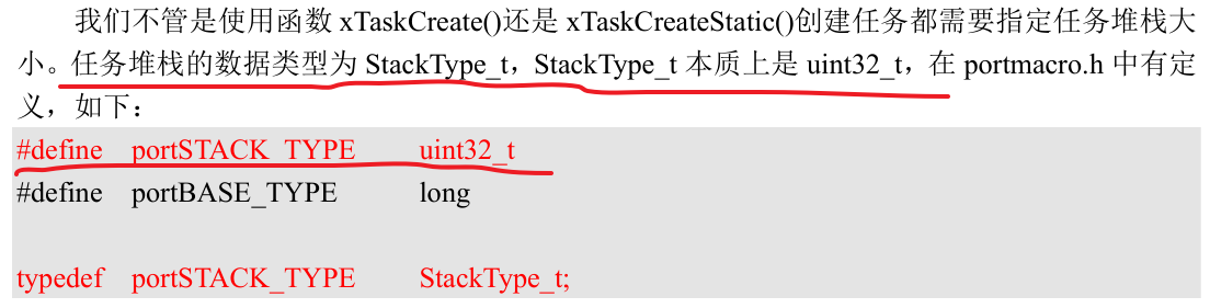 可以看出 StackType_t 类型的变量为 4 个字节,那么任务的实际堆栈大小就应该是我们所定义的 4 倍。