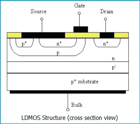 VMOS 多用于中功率场景,如功率放大器(power amplifier)和开关电路等。而 LDMOS 则是横向扩散结构,沟道由栅极长度、源极和漏极扩散共同确定,其独特之处在于通过 p + 区域与源极短接消除了体效应(body effect),使阈值电压(threshold voltage)更加稳定,沟道电流同时受栅极诱导的垂直电场(vertical electric field)和源漏之间的横向电场(lateral electric field)控制。LDMOS 具有低导通电阻和高阻断电压(blocking voltage)的特点,在射频(Radio Frequency,RF)领域应用广泛,尤其是移动通信基站和雷达系统中,其高频线性度(high-frequency linearity)优势明显。