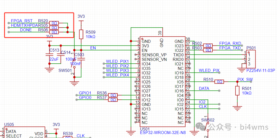 2)FPGA不能正常烧录,本来是想控制ESP32, 等FPGA加载好固件后,ESP32再启动,配置FPGA的输出灯珠数,这样连接直接导致FPGA不能烧录FLASH固件,去掉R520,R505后功能正常
