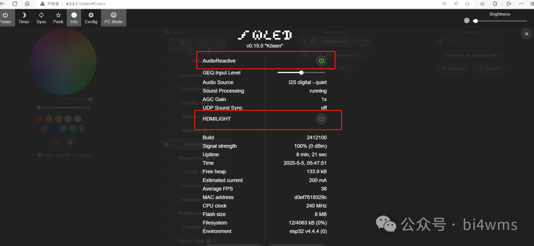 5)目前WLED切换控制律动,流光溢彩,以及配置流光溢彩的灯珠数功能都有效,但是配置灯珠数比较多的时候,会卡死,这个还需要排查
