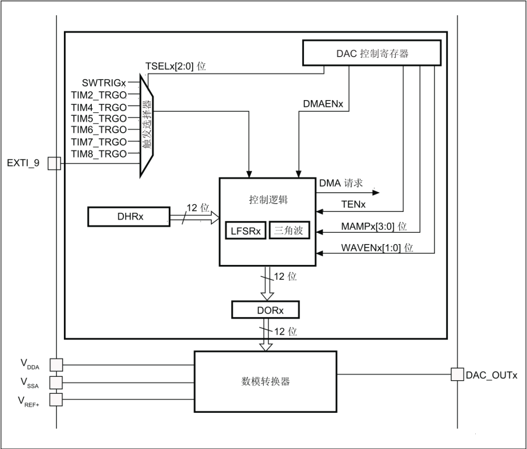 选择器:通过TSELx[2:0]位来选择触发源。该模块的作用是决定 DAC 转换的启动信号来源,可根据实际需求选择软件触发、定时器触发或外部中断触发等方式。