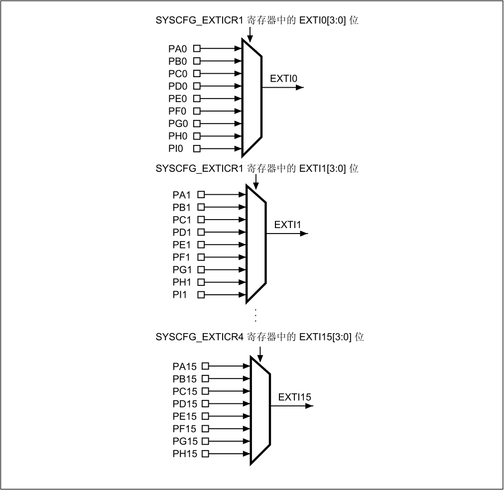 stm32f4xx共有23 条外部中断/事件线,其中多达 140 个 GPIO(STM32F405xx/07xx 和 STM32F415xx/17xx的GPIOx.0~GPIOx.15 )通过以下方式连接到 16 根外部中断/事件线,触发事件可配置为上升沿触发、下降沿触发或边沿触发。GPIO与外部中断/事件EXTI0~EXTI15 连接关系如下图: