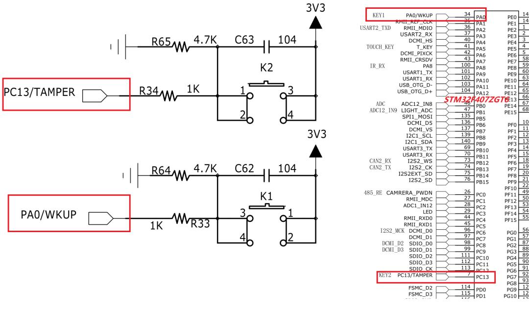 KEY1和KEY2的输出信号直接与stm32的PA0和PC13连接,按下按键使PA0和PC13变为高电平,释放按键使PA0和PC13变为低电平,通过电路设计可以使得按下时产生电平变化。2个GPIO口设置成外部中断、上升沿触发,从而检测到KEY1和KEY2电平变化。