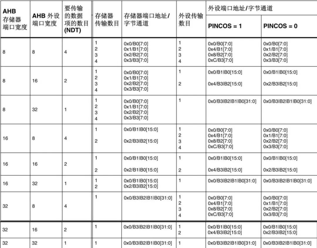 在 STM32F4xx 中,外设、存储器与 DMA 三者可能使用不同的数据宽度(8/16/32 bit)。为了让 DMA 能在任何宽度组合下正确搬运数据,手册给出一张 “可编程数据宽度、封装/解封、字节序” 速查表,用来说明 DMA 如何自动完成宽度对齐、数据打包与拆包。可编程数据宽度、封装/ 解封、字节序表如下: