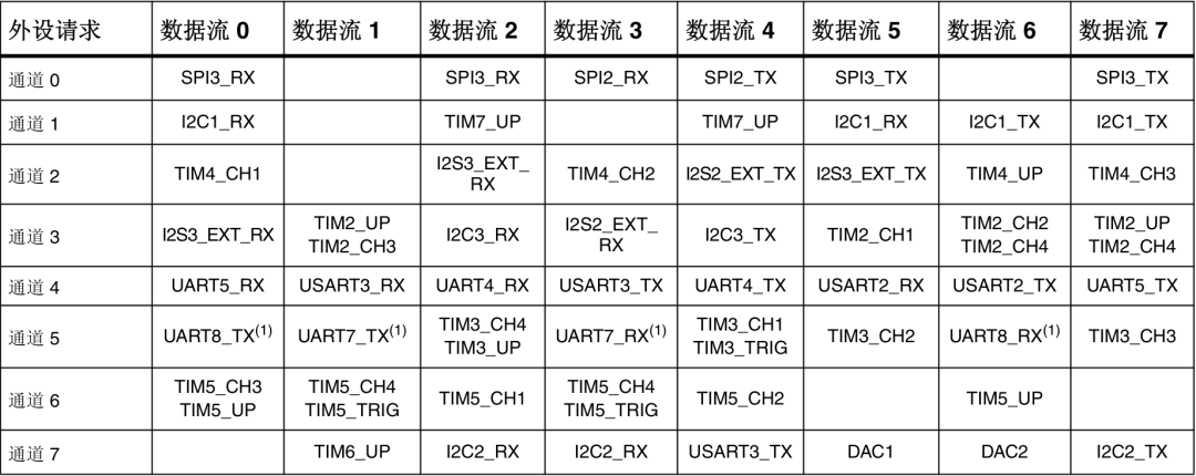 外设映射:每个 DMA 通道 / 数据流对应特定的外设请求(如 ADC、SPI、I2C、USART 等),需查阅数据手册确认具体映射关系。