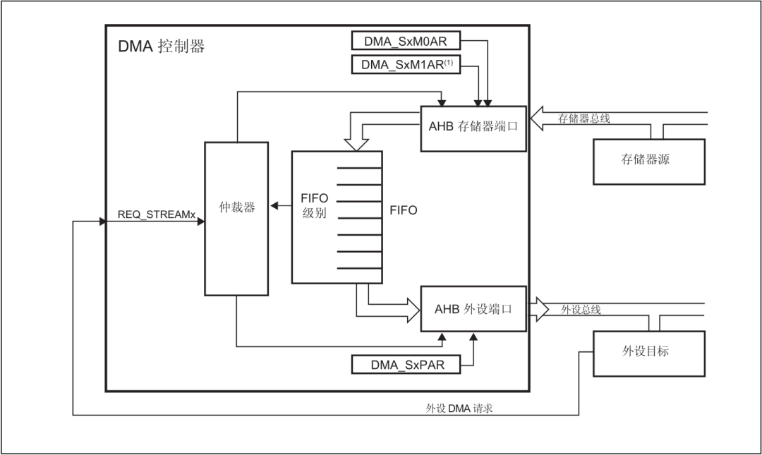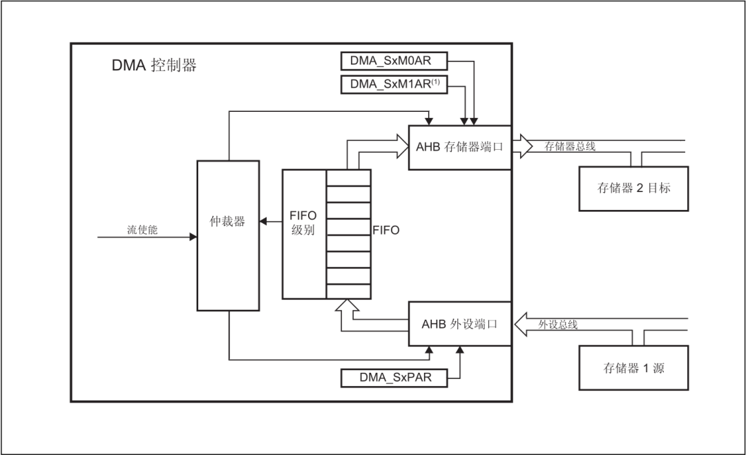 目标地址写入:DMA 控制器通过 AHB 存储器端口,将 FIFO 中的数据,写入 DMA_SxM0AR(或双缓冲模式下的 DMA_SxM1AR )指定的存储器 2 目标地址。
