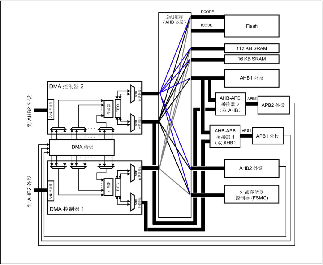 DMA1 与 DMA2 各自通过一条 AHB 主总线挂到总线矩阵上,每个控制器内部拥有 8 条数据流(Stream0-7)和 8 条请求通道(CH0-7);数据流经两级仲裁器(流级 + 通道级)后,再经 16 B FIFO,最终由外设端口或存储器端口完成外设↔存储器或存储器↔存储器搬运,其中 DMA2 额外支持 SRAM↔SRAM 全速搬运,而 DMA1 仅支持外设↔存储器方向”。