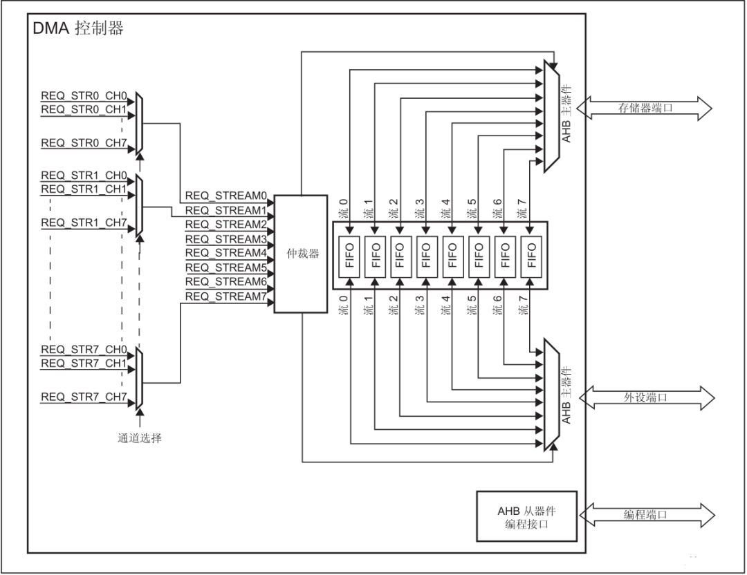外设发起请求:外设源(如 ADC、UART 等)产生数据传输需求时,通过 “外设 DMA 请求” 信号线,向 DMA 控制器发送 REQ_STREAMx(x 为数据流编号 )请求,触发 DMA 传输流程。