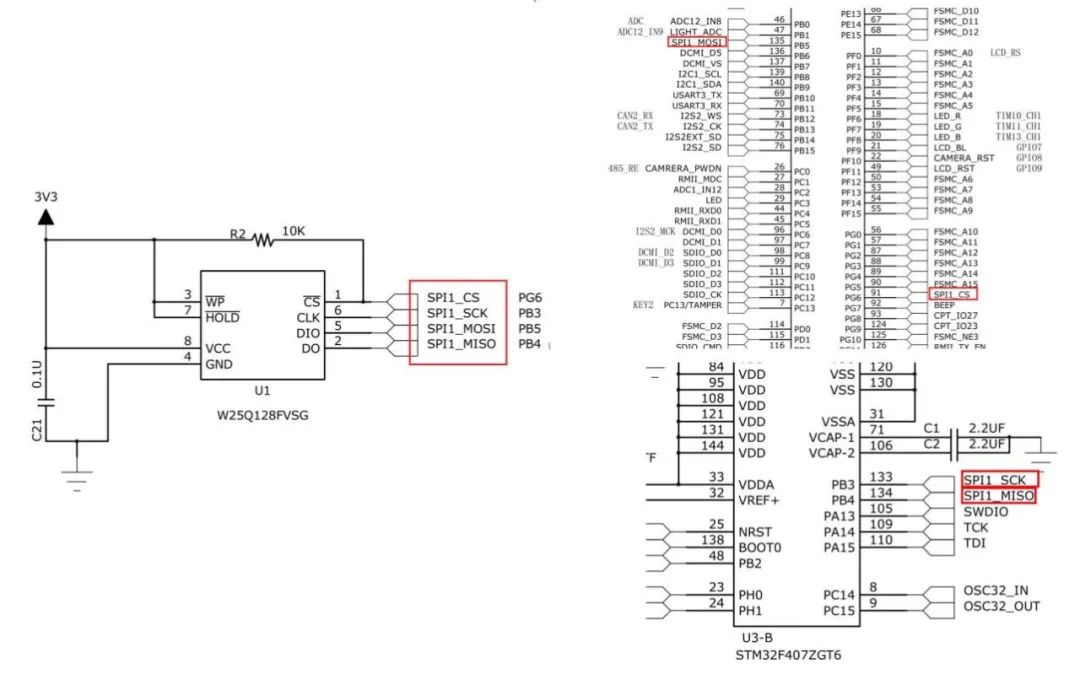 W25Q128型NOR Flash的VCC接3.3V电源,CS引脚上拉10kΩ电阻使其初始位禁用状态,VCC与GND间并联0.1μF去耦电容,SPI接口与STM32对应引脚相连,STM32与W25Q128芯片共地。