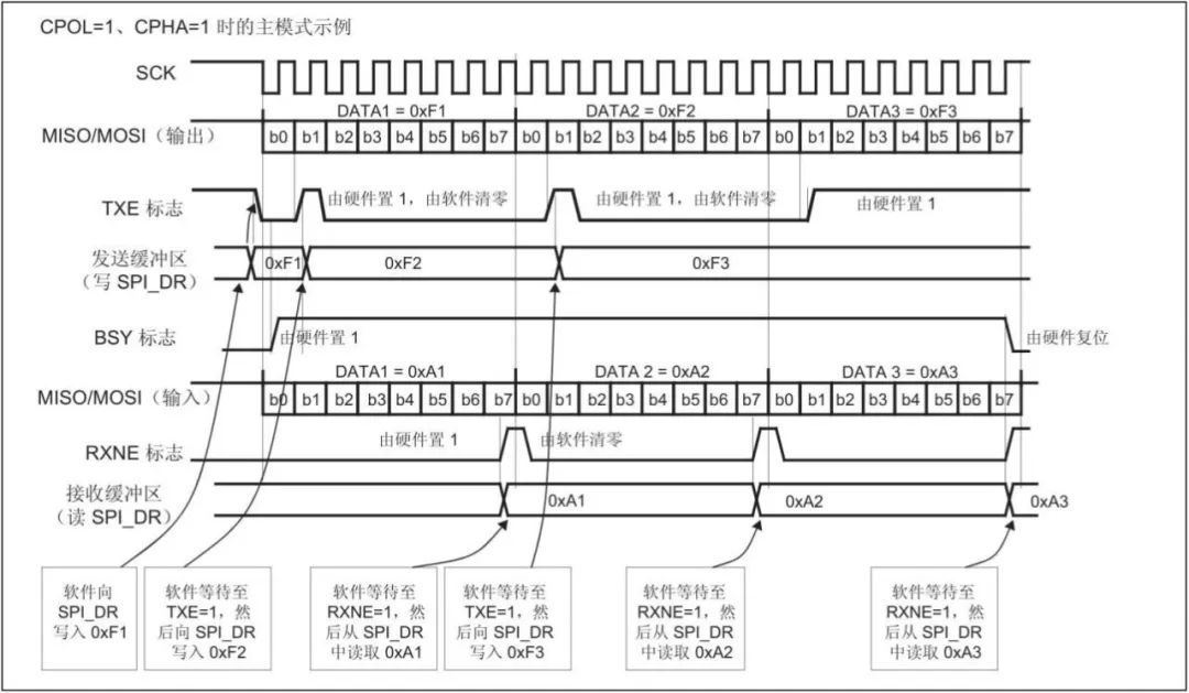 启动SPI传输:通过写SPI_DR寄存器发送数据,同时读取SPI_DR寄存器接收数据。