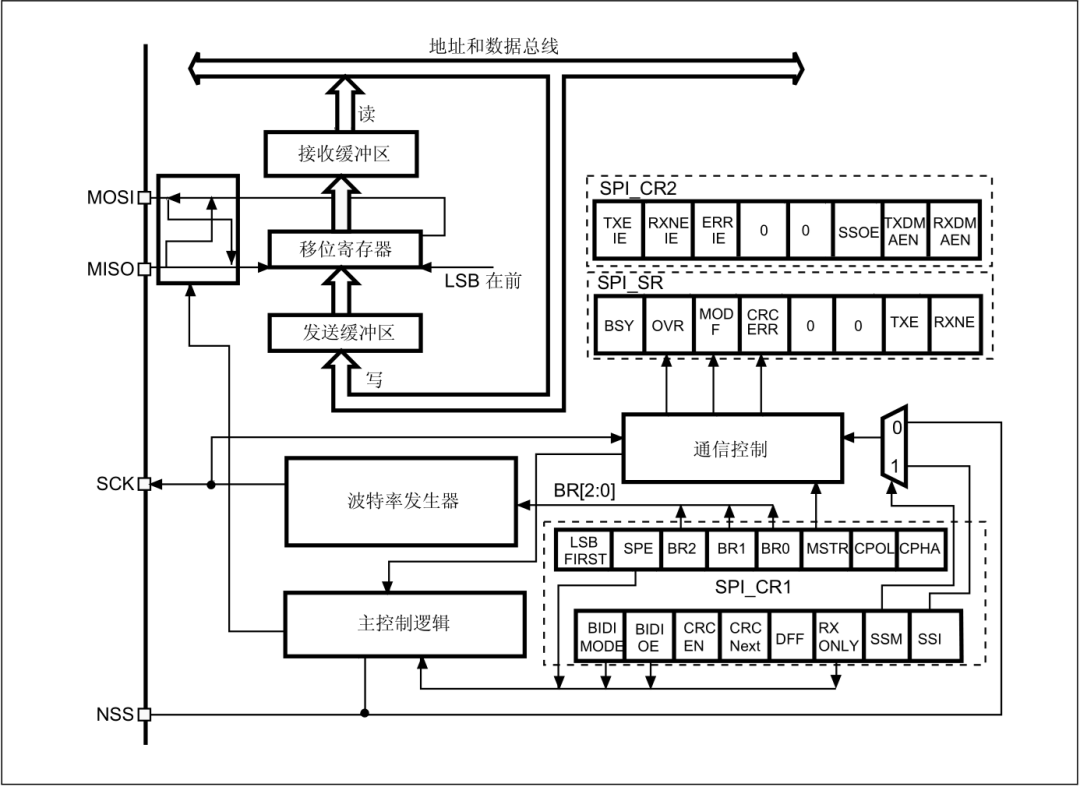以全双工主机模式为例,SPI_CR1 配置模式、波特率等基本参数,SPI_CR2 控制 DMA 和中断,SPI_SR 显示状态标志,SPI_RXCRCR 和 SPI_TXCRCR 处理 CRC 校验。SPI_CR1 配置基本模式与参数,SPI_CR2 控制中断与 DMA,SPI_SR 反映工作状态,SPI_RXCRCR/TXCRCR 处理 CRC 校验,共同完成 SPI全双工主机模式配置。