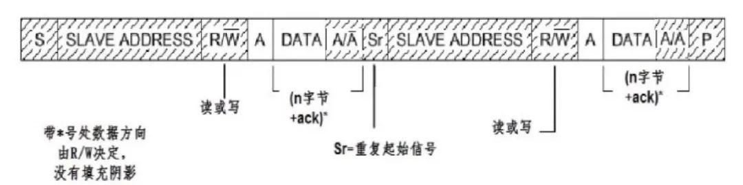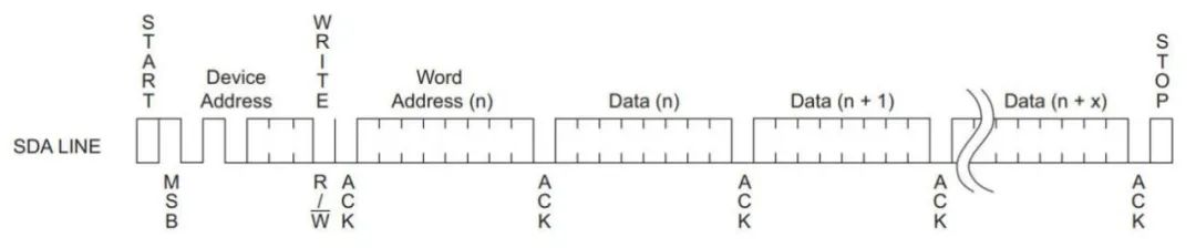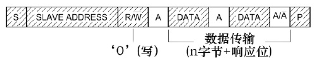 S → 从机地址(0) → ACK → 数据字节1 → ACK → 数据字节2 → ACK → P