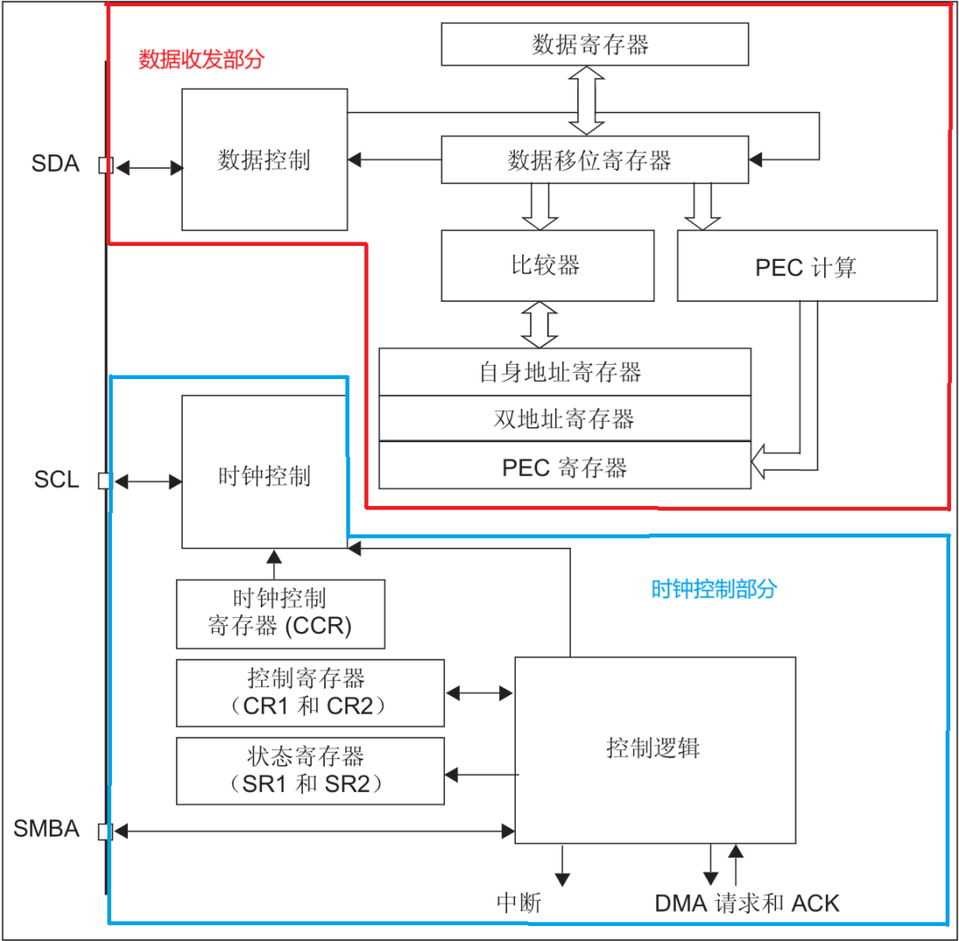 以stm32f40x为例,框图显示:数据移位寄存器是 SDA 线与 DR 寄存器之间的桥梁,所有数据收发均通过移位寄存器完成。