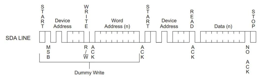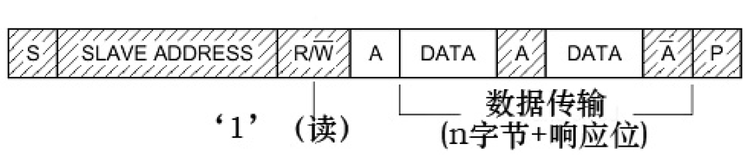 S → 从机地址(1) → ACK → 数据字节1 → 主机ACK → 数据字节2 → 主机NACK → P。