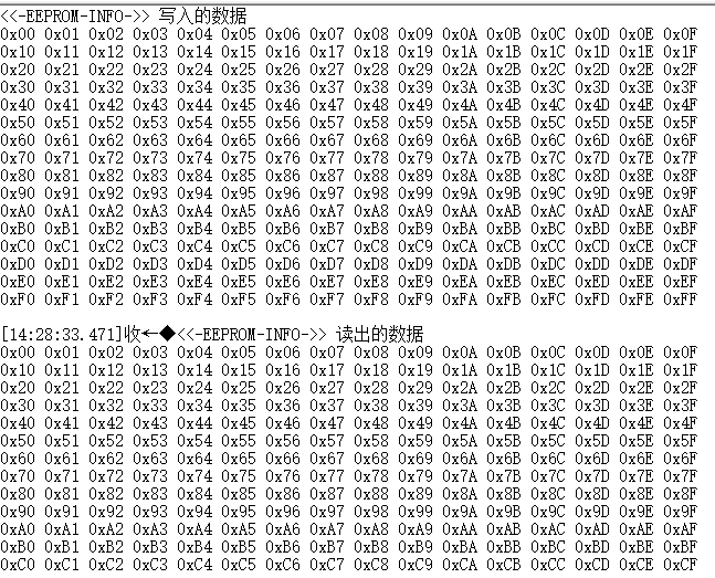 stm32的I2C配置为主模式,通过I2C总线向EEPROM指定存储器地址写入数据,再通过I2C向EEPROM指定存储器地址读出数据,比较写入和读出的数据是否不一致,将结果通过串口打印出来。