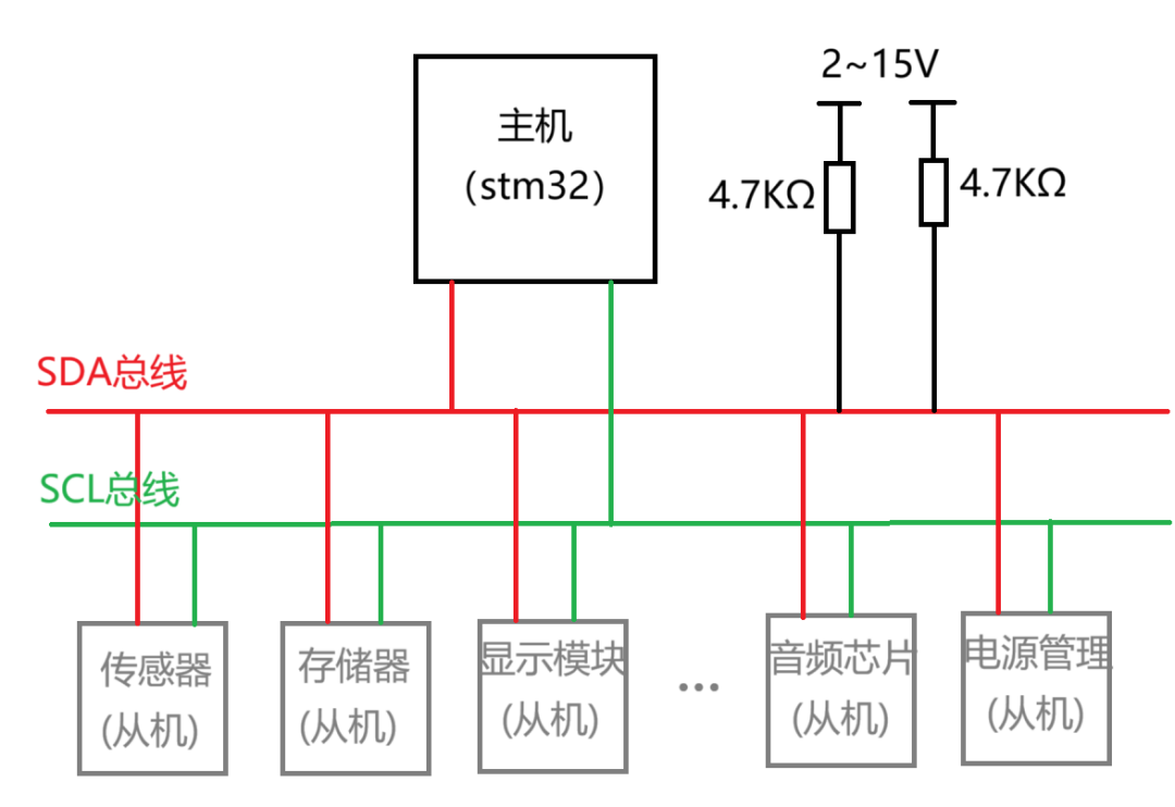 线在空闲状态下保持高电平。总线支持多设备共线连接,各设备通过地址区分身份,主机负责发起通信并控制时钟,从机响应主机命令。