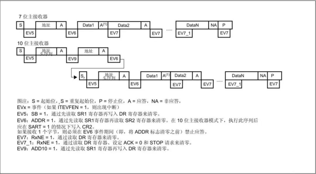 // 生成起始位I2C_GenerateSTART(I2C1, ENABLE); // 发送从机地址(读操作)I2C_Send7bitAddress(I2C1, SLAVE_ADDRESS, I2C_Direction_Receiver); // 接收多个字节if (num_bytes > 1) { // 启用ACK I2C_AcknowledgeConfig(I2C1, ENABLE); while (num_bytes-- > 2) { // 等待接收完成 while (!I2C_CheckEvent(I2C1, I2C_EVENT_MASTER_BYTE_RECEIVED)); data[i++] = I2C_ReceiveData(I2C1); }} // 最后一个字节前禁用ACKI2C_AcknowledgeConfig(I2C1, DISABLE); (等待I2C_EVENT_MASTER_MODE_SELECT事件,确保总线已释放) // 重新生成起始位I2C_GenerateSTART(I2C1, ENABLE); // 发送从机地址(读操作)I2C_Send7bitAddress(I2C1, SLAVE_ADDRESS, I2C_Direction_Receiver); // 接收多个字节if (num_bytes > 1) { // 启用ACK I2C_AcknowledgeConfig(I2C1, ENABLE); while (num_bytes-- > 2) { // 等待接收完成 while (!I2C_CheckEvent(I2C1, I2C_EVENT_MASTER_BYTE_RECEIVED)); data[i++] = I2C_ReceiveData(I2C1); }} // 最后一个字节前禁用ACKI2C_AcknowledgeConfig(I2C1, DISABLE);I2C_GenerateSTOP(I2C1, ENABLE);// 接收最后一个字节while (!I2C_CheckEvent(I2C1, I2C_EVENT_MASTER_BYTE_RECEIVED));data[i] = I2C_ReceiveData(I2C1);