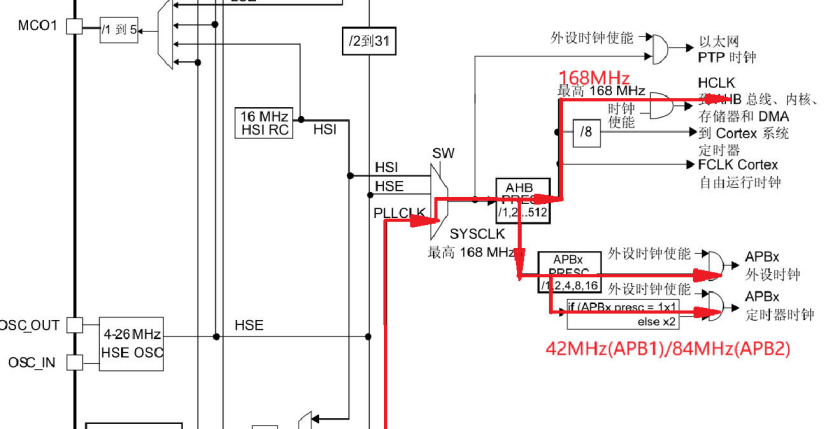 PCLK1=HCLK/4=168/4=42MHz(注:APB1 外设定时器时钟 = 2 × PCLK1 = 84 MHz(因 APB1 分频系数 >1))