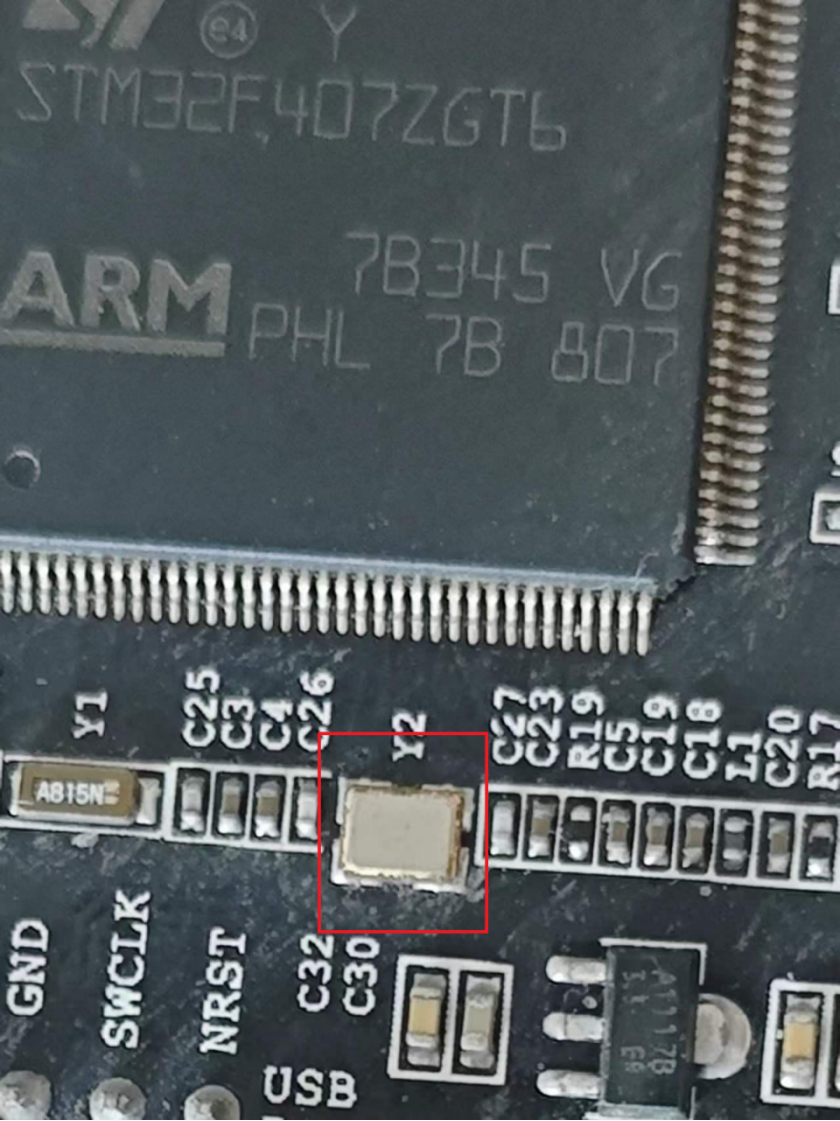 int main(void){ //选择HSE(25MHz),m=25,n=336,p=2,q=7,系统时钟设置为168M, HCLK=168M, PCLK1=HCLK/4=42MHz, PCLK2=HCLK/2=84MHz HSE_SetSysClock(25, 336, 2, 7); // LED 端口初始化 LED_GPIO_Config(); // MCO1 输出PLLCLK, PLLCLK = 168 MHz、MCO1 分频系数 = 4、时钟源选择 = PLLCLK, fMCO1=168MHz/4=42MHz HAL_RCC_MCOConfig(RCC_MCO1,RCC_MCO1SOURCE_PLLCLK, RCC_MCODIV_4); // MCO2 输出SYSCLK,SYSCLK = 168 MHz、MCO2 分频系数 = 2、时钟源选择 = SYSCLK, fMCO2=168MHz/2=84MHz HAL_RCC_MCOConfig(RCC_MCO2,RCC_MCO2SOURCE_SYSCLK, RCC_MCODIV_2); while (1) { LED2( ON ); // 亮 Delay(0x5FFFFF); LED2( OFF ); // 灭 Delay(0x5FFFFF); }}