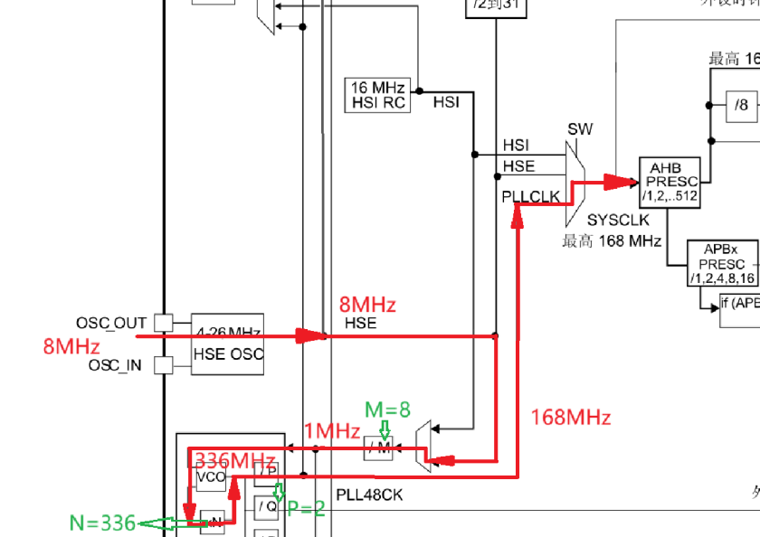 f_PLLP=8MHz/8×336÷2=168MHz,即得到_SYSCLK。