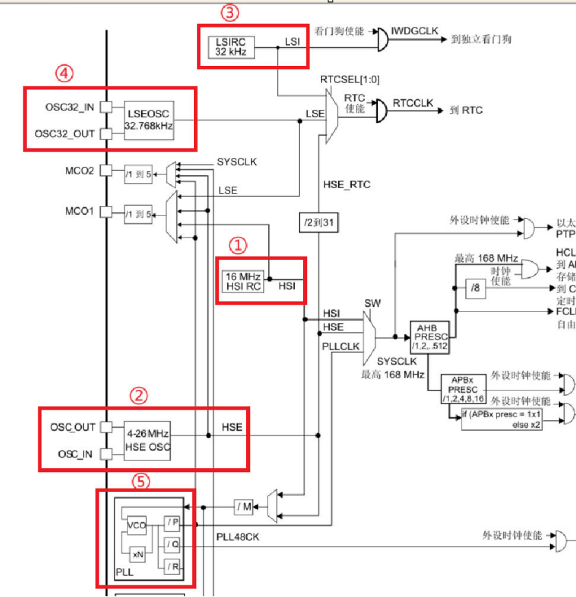 除了常用的SYSCLK、HCLK、PCLK1、PCLK2时钟,以及MCO1/MCO2输出功能,stm32f4xx系列单片机还有看门狗时钟、RTC时钟、PLL48CLK时钟等,下面进行简单介绍。