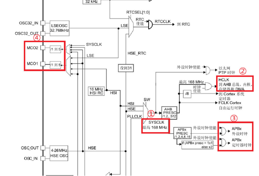 1.SYSCLK:系统主时钟,可来自 HSI、HSE 或 PLLP,典型配置 168 MHz。