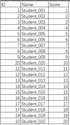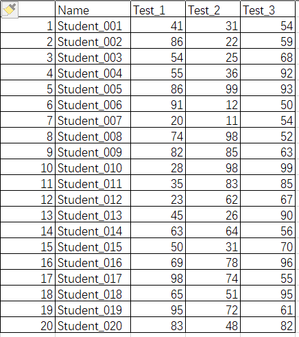 ID Name Test_1 Test_2 Test_3 Score0 1 Student_001 41.0 31.0 54.0 1.01 2 Student_002 86.0 22.0 59.0 2.02 3 Student_003 54.0 25.0 68.0 3.03 4 Student_004 55.0 36.0 92.0 4.04 5 Student_005 86.0 99.0 93.0 5.05 6 Student_006 91.0 12.0 50.0 6.06 7 Student_007 20.0 11.0 54.0 7.07 8 Student_008 74.0 98.0 52.0 8.08 9 Student_009 82.0 85.0 63.0 9.09 10 Student_010 28.0 98.0 99.0 20.010 11 Student_011 35.0 83.0 85.0 11.011 12 Student_012 23.0 62.0 67.0 12.012 13 Student_013 45.0 26.0 90.0 13.013 14 Student_014 63.0 64.0 56.0 14.014 15 Student_015 50.0 31.0 70.0 15.015 16 Student_016 69.0 78.0 96.0 16.016 17 Student_017 98.0 74.0 55.0 17.017 17 Student_018 NaN NaN NaN 18.018 18 Student_018 65.0 51.0 95.0 NaN19 19 Student_019 95.0 72.0 61.0 19.020 20 Student_020 83.0 48.0 82.0 10.0